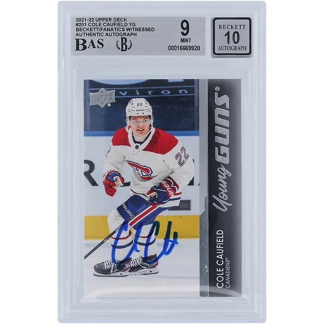 Carte recrue 9/10 autographiée par Cole Caufield des Canadiens de Montréal 2021-22 Upper Deck Series 1 Young Guns #201 Beckett Fanatics Witnessed Authenticated