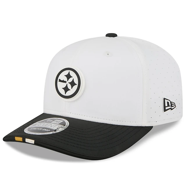 Casquette ajustable 9SEVENTY New Era blanche/noire pour homme, camp d'entraînement NFL 2025 des Pittsburgh Steelers