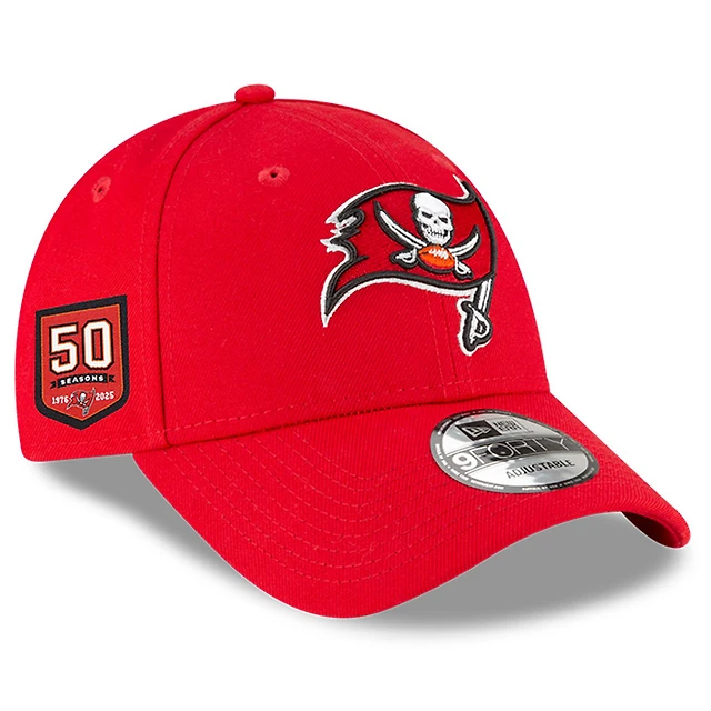 Casquette ajustable New Era 9FORTY rouge pour homme, écusson latéral, 50e saison des Tampa Bay Buccaneers
