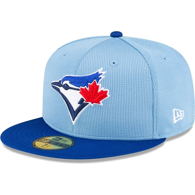 Casquette ajustée 59FIFTY pour hommes, bleu poudre, Toronto Blue Jays 2024, entraînement au bâton sur le terrain, New Era