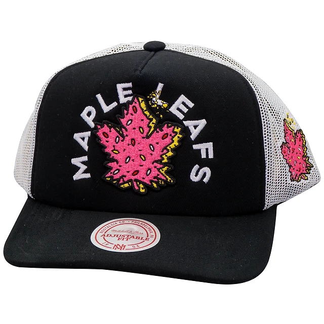 Casquette de camionneur à visière rabattable noire/blanche pour homme des Maple Leafs de Toronto, motif beignet et miettes, Mitchell & Ness