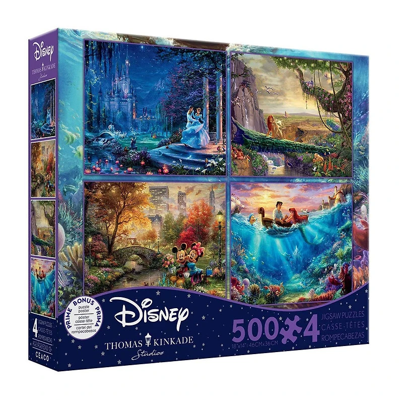 Ceaco Thomas Kinkade Disney 4-in-1 500-Piece Puzzle Multipack (Cinderella, Lion King, Mickey, Little Mermaid)