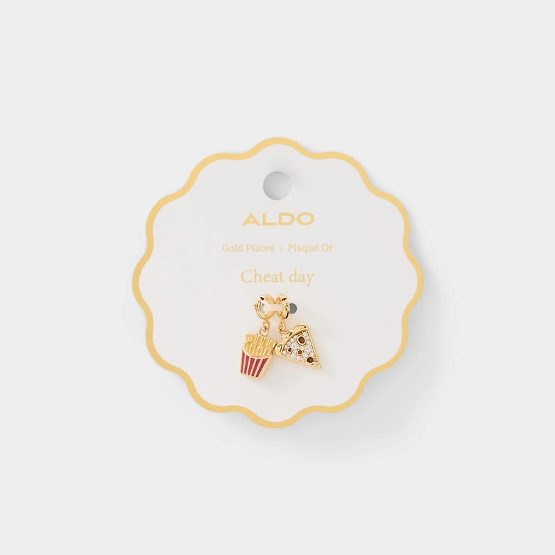 Gold-plated charms whirl along post-backs, cheekily nodding to cheat-day cravings—from fries to pizza—creating snack-cart sparkle that catches the light with every playful turn as you move through the night. Layer them under a satin blouse for date-night drama, or stack with a blazer and denim for a city-day look.
