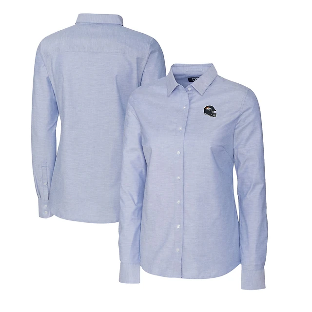 Chemise boutonnée à manches longues en tissu Oxford extensible bleu clair pour femme Cutter & Buck avec logo du casque des Denver Broncos