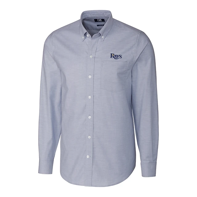 Chemise boutonnée à manches longues en tissu Oxford extensible bleu marine pour homme, modèle Cutter & Buck, des Tampa Bay Rays, de taille grande et