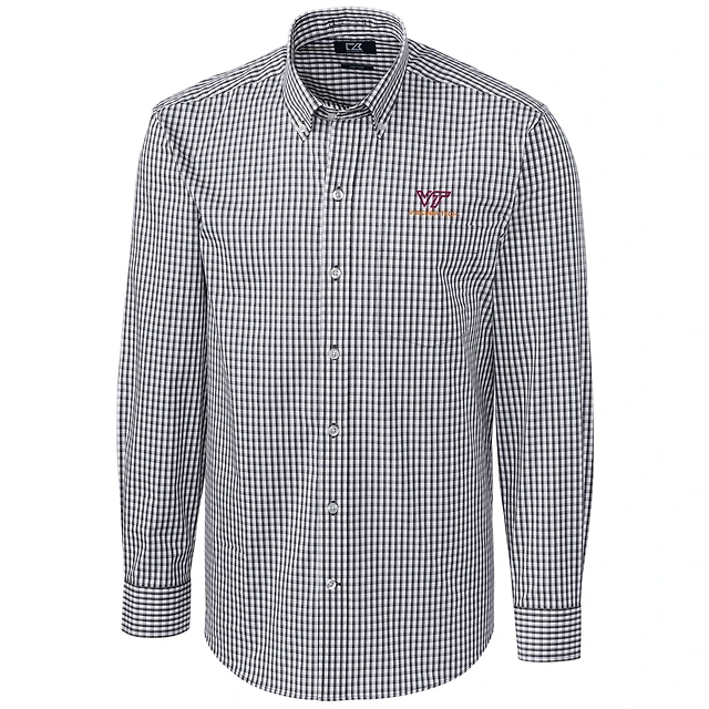 Chemise boutonnée à manches longues et carreaux extensibles pour homme, couleur anthracite, style Virginia Tech Hokies, de grande taille, Cutter & Buck