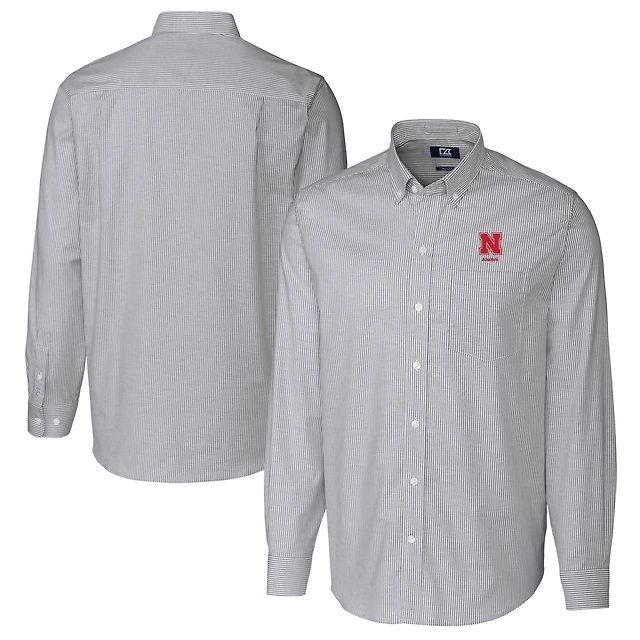 Chemise boutonnée à manches longues et rayures Oxford extensibles pour homme, couleur anthracite, avec logo des anciens Nebraska Huskers, Cutter & Buck