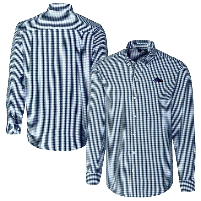 Chemise boutonnée à manches longues pour homme, bleu marine, coupe Cutter & Buck, Baltimore Ravens, extensible, facile d'entretien, motif vichy, grande taille