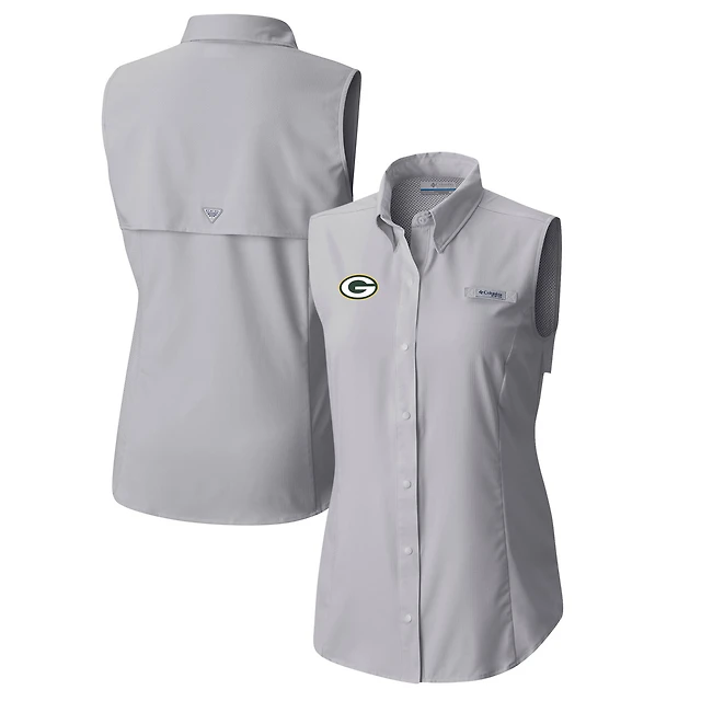 Chemise boutonnée sans manches Columbia Grey Green Bay Packers PFG Tamiami Omni-Shade pour femme