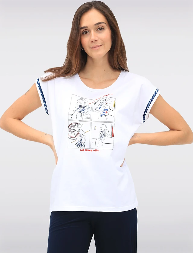 Chic Sleeveless Stretch Cotton Top Featuring a Red & Navy Playful Print by Orly