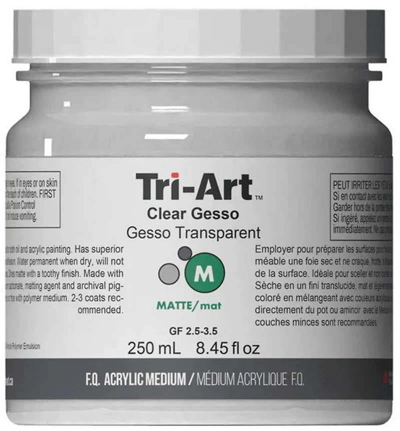 Clear Gesso is similar to traditional gesso. It will seal but it will not hide the surface being prepared, for example, if painting a piece of wood, the grain will still be visible even after the product is applied. In addition, clear gesso can be tinted by adding a small quantity of transparent acrylic paint.  It dries to a translucent, matte, and lightly toothy finish that can be sanded.      Made in Canada