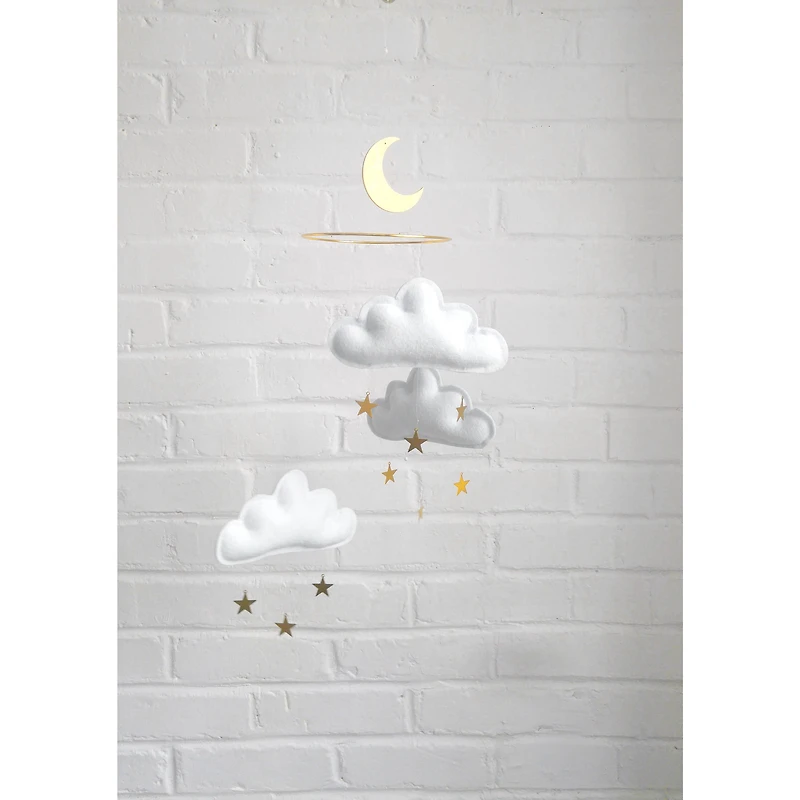 A dreamy baby mobile that adds a touch of magic to your nursery, with soft clouds in calming White tones. This felt cloud mobile with golden stars is an ideal newborn gift.