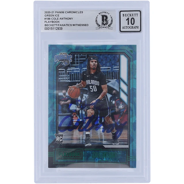 Cole Anthony Orlando Magic autographié 2020-21 Panini Chronicles Playbook Green Ice Prizm #186 Beckett Fanatics a été témoin d'une carte recrue authentifiée 10