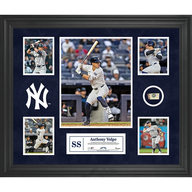 Collage encadré de 5 photos d'Anthony Volpe des Yankees de New York avec un morceau de ballon utilisé lors du match
