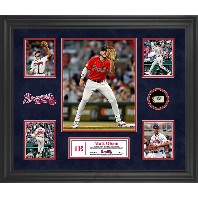 Collage encadré de 5 photos de Matt Olson des Braves d'Atlanta avec un morceau de ballon utilisé lors du match