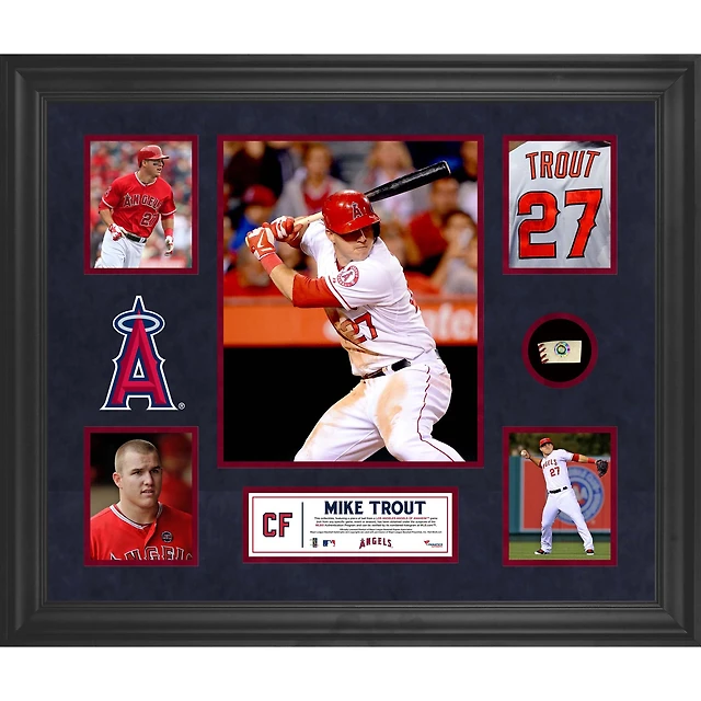 Collage encadré de 5 photos de Mike Trout des Los Angeles Angels avec un morceau de ballon utilisé lors du match