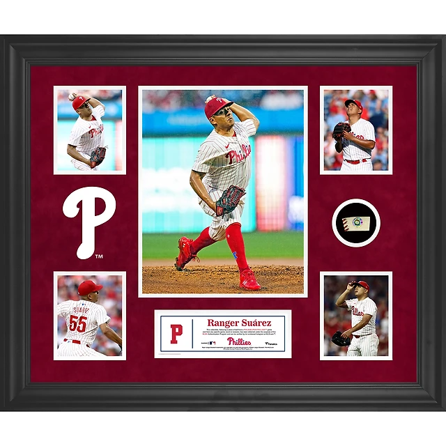 Collage encadré de 5 photos de Ranger Suarez des Philadelphia Phillies avec un morceau de balle utilisée lors du match
