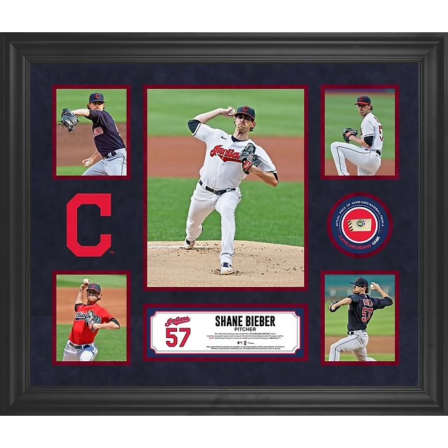 Collage encadré de 5 photos de Shane Bieber des Cleveland Indians avec un morceau de ballon utilisé lors du match