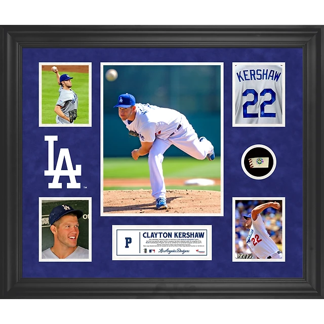 Collage encadré de 5 photos des Dodgers de Los Angeles de Clayton Kershaw avec un morceau de ballon utilisé lors du match