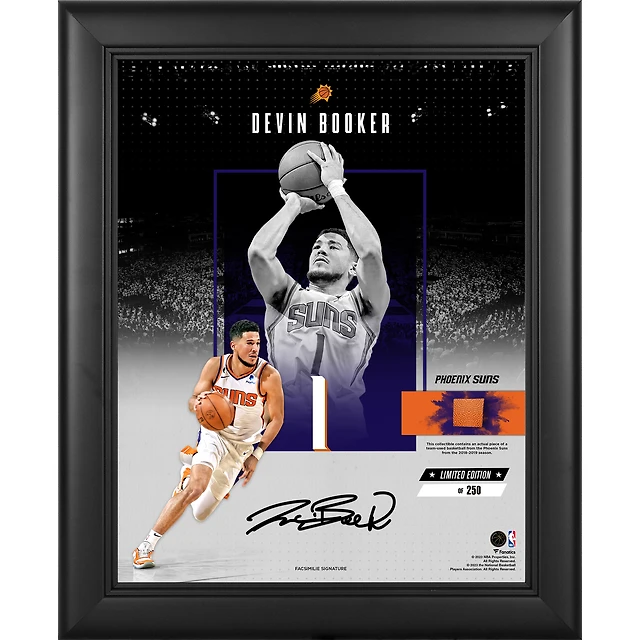Collage Impact encadré de 11 x 35 cm, reproduction de la signature de Devin Booker, Phoenix Suns, avec un ballon de basket utilisé par l'équipe - Édition limitée à 250 exemplaires
