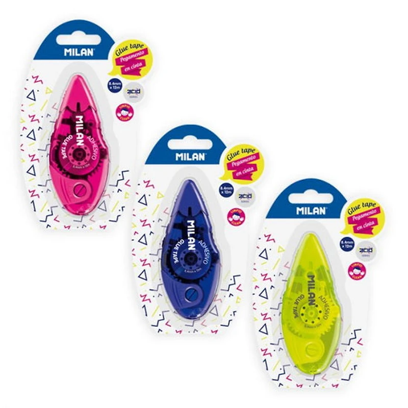 Colle en ruban polyvalente, précise et facile à utiliser. Séchage rapide. Design ergonòmique avec un capuchon qui protège la pointe. Idéal pour l'artisanat, le scrapbooking et les photo albums. Série Acid en 3 couleurs translucides: bleu, jaune et rose. 8,4 mm de large x 12 m de longueur.