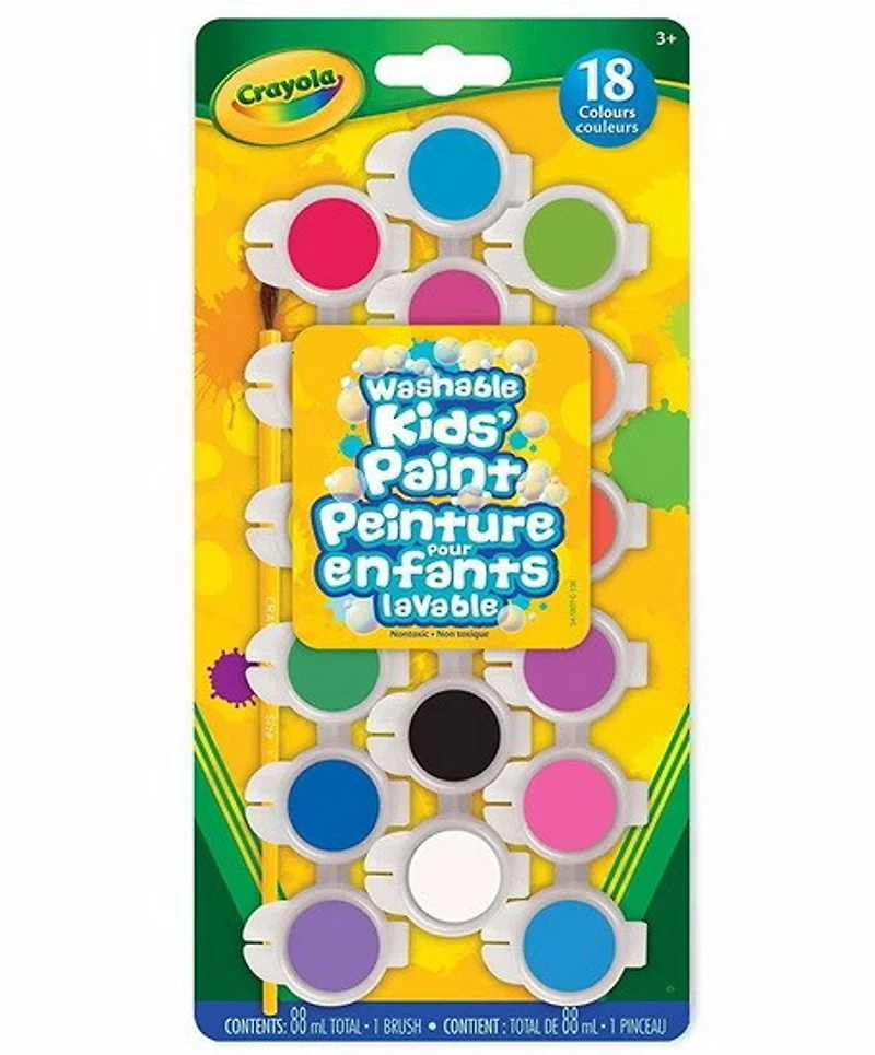 Crayola Washable Kids' Paint is a non-toxic, water-based paint for arts and crafts, posters and school projects. This paint can be applied with brushes sponges, stamps, stencils, and more. Specially formulated to easily wash off skin and clothing.This set includes 18 paint colours and and 1 high-quality paintbrush.