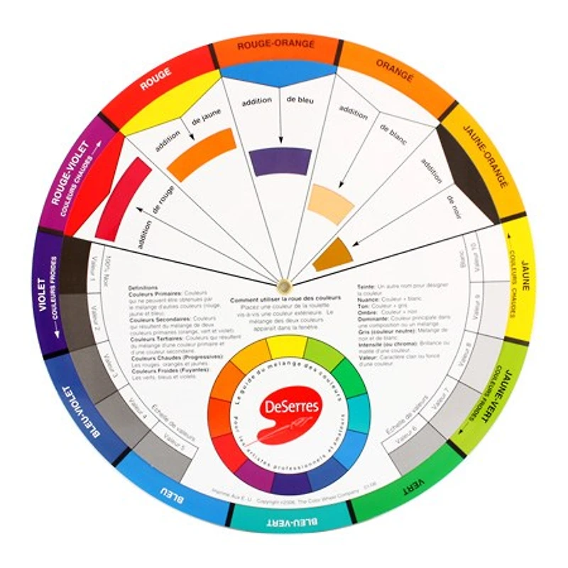 This colour wheel is a complete guide to mixing colours. This colour wheel includes a value scale, colour nuances, tones, shadows, information regarding hot and cold colours, primary and secondary colours and illustrates how to mix colours to create colour harmonies. To use: Turn the wheel to align the color on the interior wheel with the color indicated along the edge of the exterior wheel, the resulting colour is displayed in a window on the interior wheel.A colour wheel is a practical reference tool for both the beginner as well as the accomplished artist. This product is also available in French.