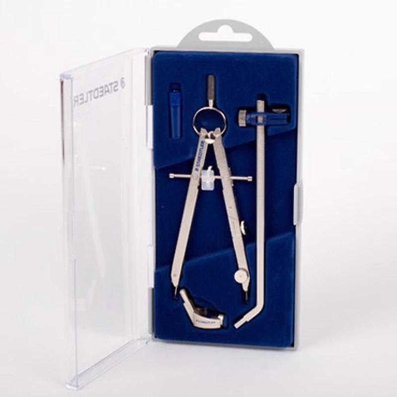 This compass set is ideal for advanced school-goers, apprentices and students. It contains a compass, an extension bar, a universal adapter and spare parts in a hinged lid box. Spare parts, such as leads and needles, are also sold separately.