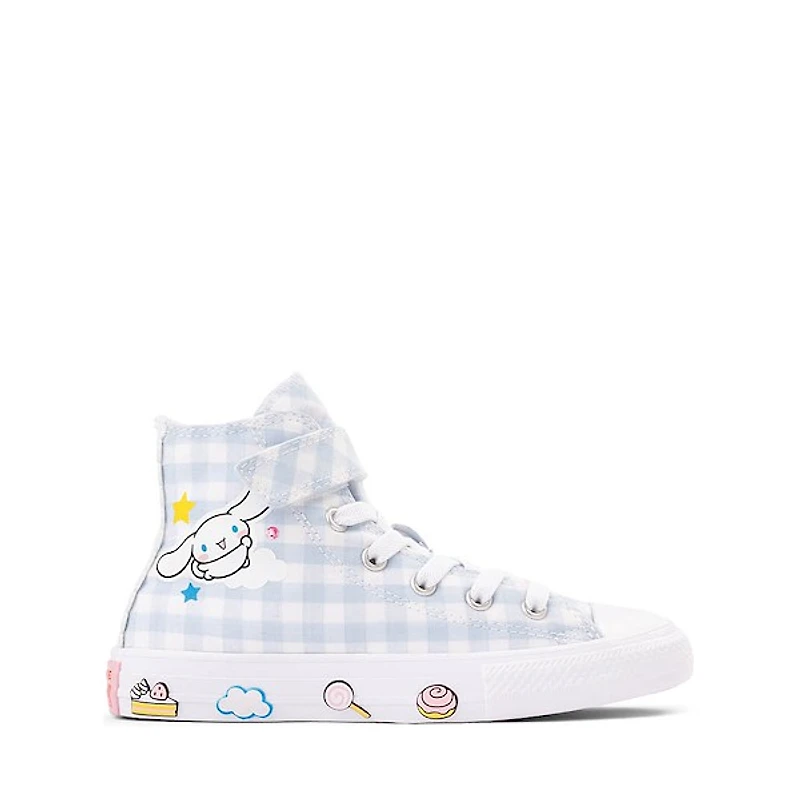 Float into sweet style with the converse x hello kitty® & friends chuck taylor all star easy-on high-top cinnamoroll sneaker. This baby blue gingham high-top features cinnamoroll graphics with playful cloud, candy, and dessert-inspired details for an extra-cute finish. The easy-on design with hook-and-loop strap helps little feet get ready fast, while classic chuck elements like the rubber toe cap and striped midsole keep the look iconic. Finished with a durable rubber outsole for everyday fun.