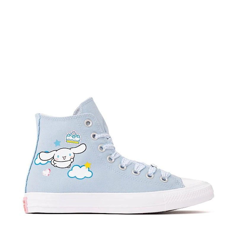 Float into sweet style with the converse x hello kitty® & friends chuck taylor all star high-top cinnamoroll sneaker. This soft baby blue high-top features cinnamoroll front and center with playful cloud and star graphics for a dreamy finish. Classic chuck details like the rubber toe cap, striped midsole, and lace-up front keep the look timeless. Finished with a durable rubber outsole for everyday wear with extra charm.   available exclusively at journeys.