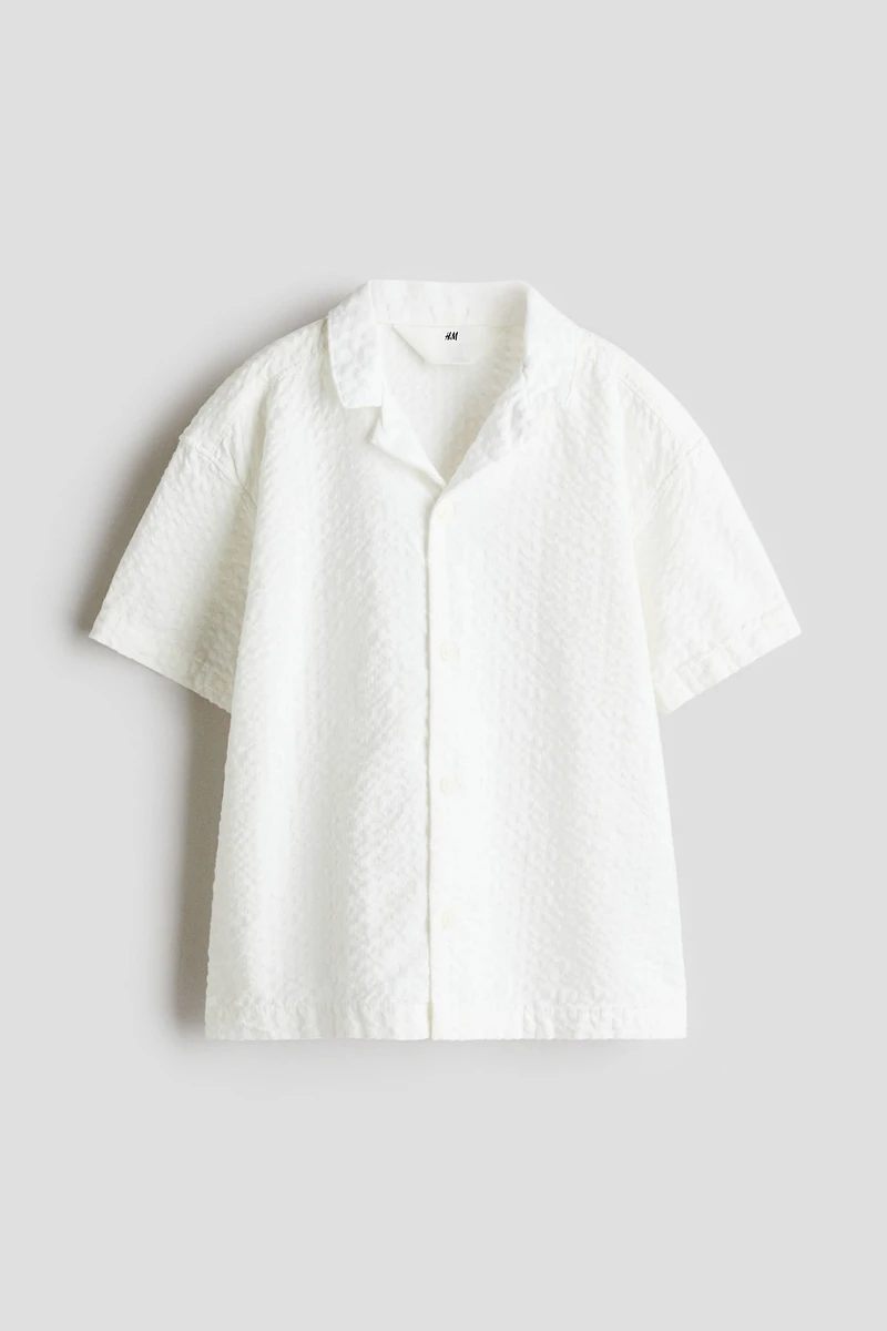 Shirt in soft cotton seersucker. Resort collar, buttons at front, dropped shoulders, and short sleeves.