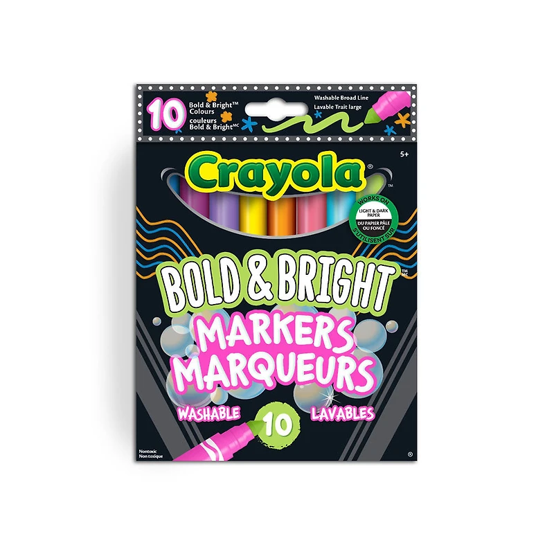 Crayola Broad Line Markers are essential kid art supplies both in and outside the classroom, and now with Bold and Bright Crayola colours, they make a statement on light and dark paper. Perfect for beginner artists, this washable marker set washes away from skin, most washable clothing, and furniture. Whether kids are colouring in their favourite colouring pages or drawing pictures for class, each marker features a conical tip that can be used for thick or thin lines. Pair these kids markers with other Bold and Bright products including Twistables Coloured Pencils, and Crayons (each sold separately) for a fun bundled gift idea.