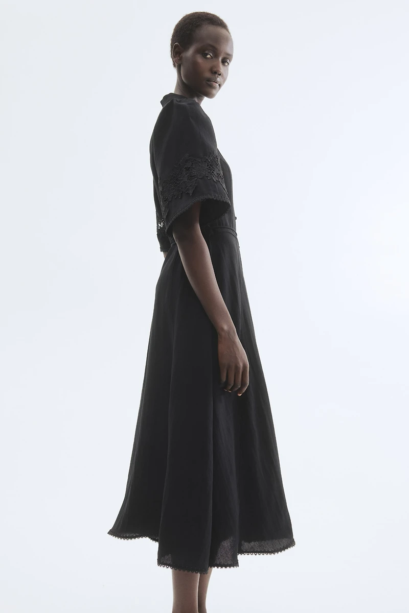 Long dress in crinkled woven fabric with princess seams at front and back. Band collar, covered buttons at front, and a narrow, beaded-end tie belt at waist. Wide elbow-length puff sleeves with eyelet embroidery, a gently flared skirt, and delicate picot trim at cuffs and hem. Unlined.