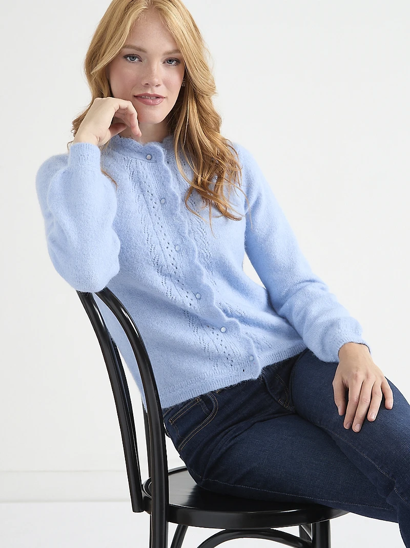 - Pointelle knit panels on either side of the placket extend from neckline to hem.
