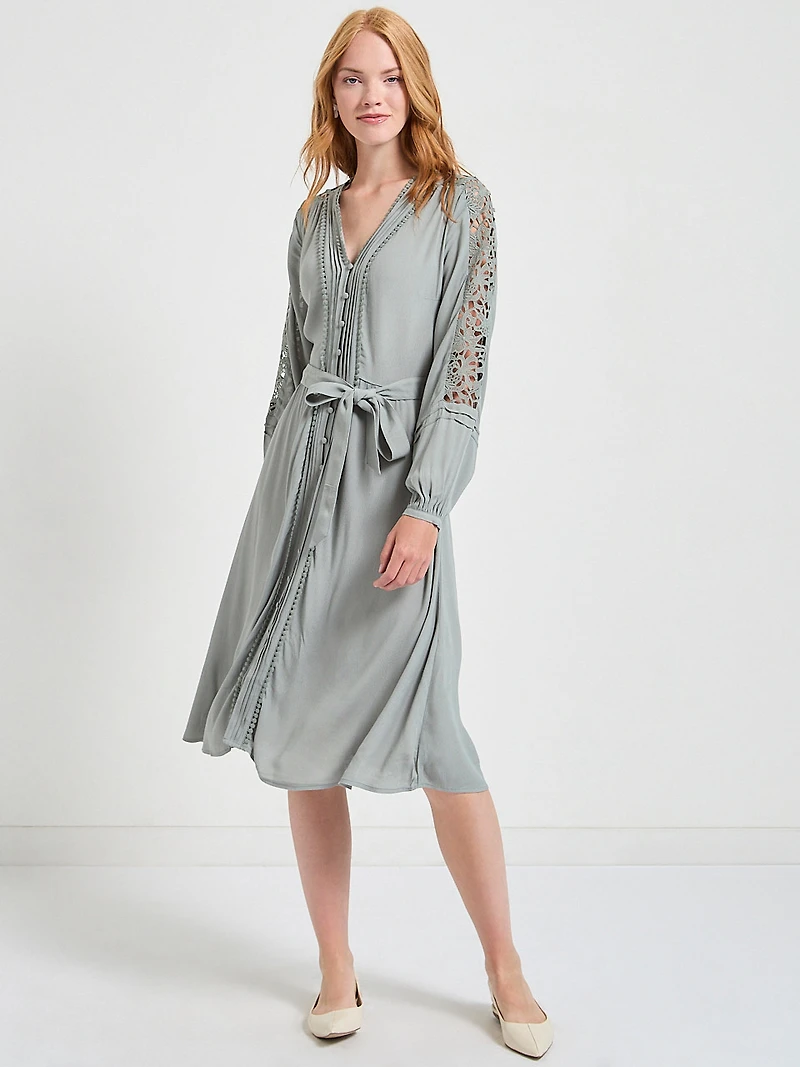 This dreamy crochet midi dress brings boho-chic vibes with its long sleeves, delicate crochet details, v-neck, and removable belt—perfect for turning heads from brunch to sunset cocktails with its playful pleated trim and fabric-covered buttons.