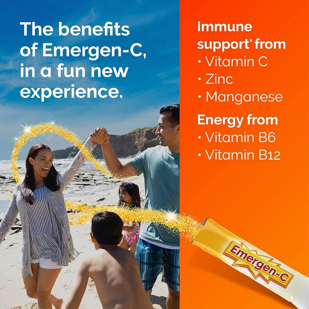 - o A sensorial experience. Feel the “pop” and hear the “fizz”, as the crystals gently dissolve in your mouth o No water needed. Rip it. Tip it. That’s it! No water or mixing needed. No big pills or chewing required o Natural fruit flavours. Available in great-tasting Orange and Strawberry flavours o On-the-go. Packaged in small individual sticks, Emergen-C Crystals are highly portable and can be taken anytime, anywhere o Immunity-supporting. Each packet is loaded with more vitamin C than 5 oranges, vitamin B12, and zinc, for daily immune support o Energy support. Loaded with B vitamins (B6) to support energy metabolism o Control your intake. Flexible dosing: use 1-2 packets per day, to get up to 1,000 mg of Vitamin C, plus other nutrients o For Adult use only o 24 individual packets per carton o Store at room temperature
