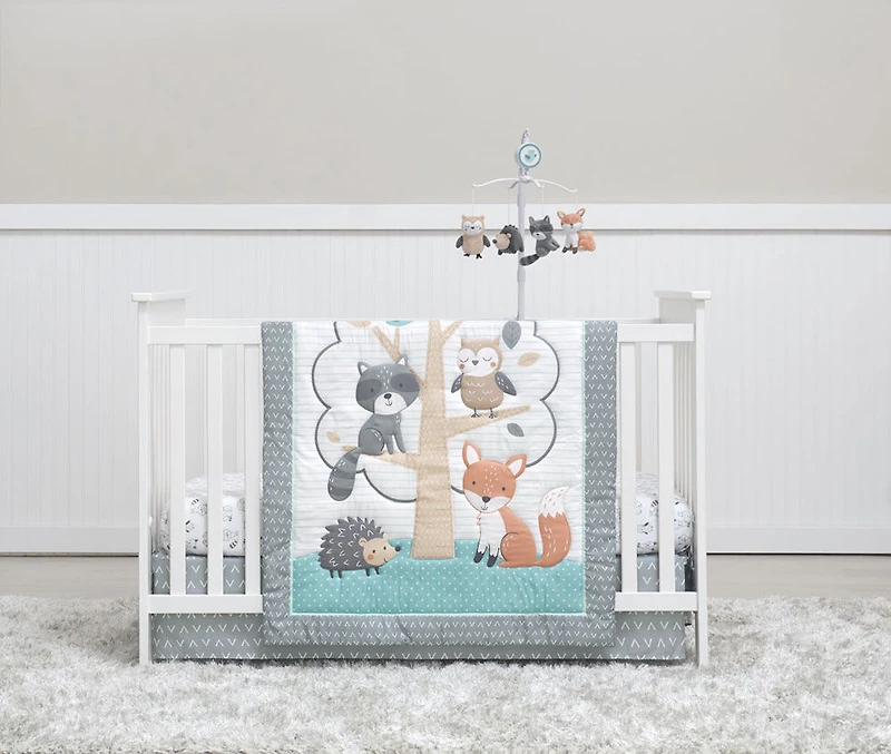Create a fun and stylish nursery for your little one with this 5-piece nursery bedding set featuring adorable owl, fox, raccoon and porcupine animals. Set includes one comforter, two fitted crib sheets, one crib skirt, and one mobile. Each piece is made with a super soft, easy-care poly fabric. This set is designed for safe and comfortable sleeping and sized to fit standard size toddler and baby mattresses. Safety note: Do not leave child unattended in crib with comforter, possible suffocation hazard. Remove mobile from crib when child can sit up, possible entanglement hazard.