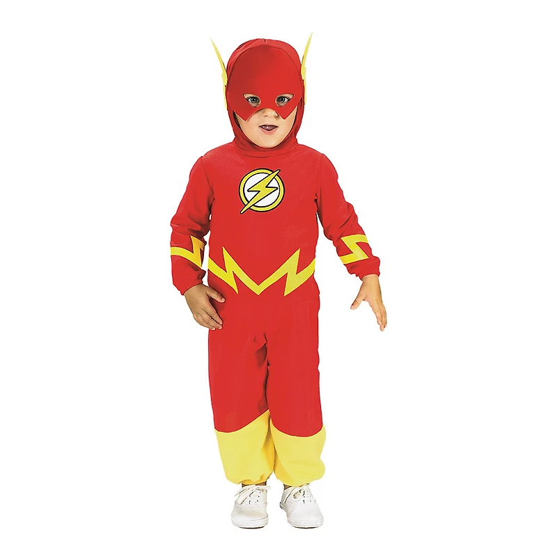 Pick up the pace at your next costume party when you get the Flash Toddler Costume for your little hero! This speedy comic book character is always up for a race or a night of running around with some friends to protect the world from bad guys. The red jumpsuit with yellow accents, red headpiece with attached yellow lightning bolts are easy ways to make sure this costume is put together quickly so you have more time for fun. Officially licensed Justice League Flash costume.