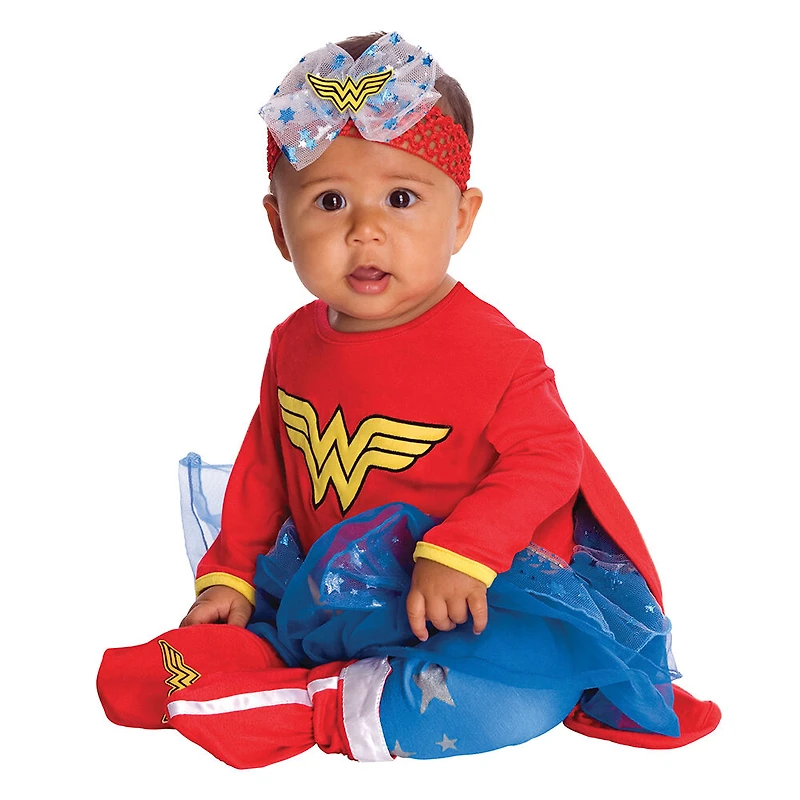 Transform your little cutie into a brave superhero this Halloween with the Wonder Woman Onesie Infant Halloween Costume. It showcases the Justice League's favorite female superhero in the most adorable way possible. This Wonder Woman onesie costume includes a Wonder Woman logo onesie and a pair of starred pants with an attached starred tutu skirt, all in classic superhero colors. It also comes with a soft, crocheted headband with a large star bow and matching logo booties. The Wonder Woman infant costume is an officially licensed DC Comics costume. It features soft, flexible material that will keep babies warm and comfortable while they're out trick-or-treating. The Wonder Woman Onesie Infant Halloween Costume can be worn as a dress-up costume all year round.