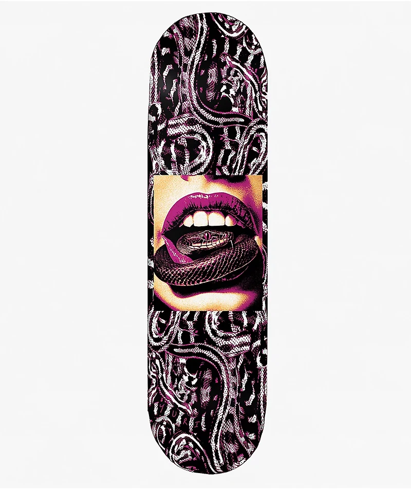 Add a sultry, reptilian vibe to your setup with the 8.25" Hiss skateboard deck from Deathwish. Made as a pro model for Yuri Facchini, the deck features a writhing snake pattern throughout highlighting a central graphic of a snake curled around a woma
