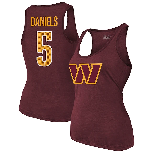 Débardeur à col rond bordeaux Jayden Daniels pour femme de Majestic Threads, avec nom et numéro des Washington Commanders.
