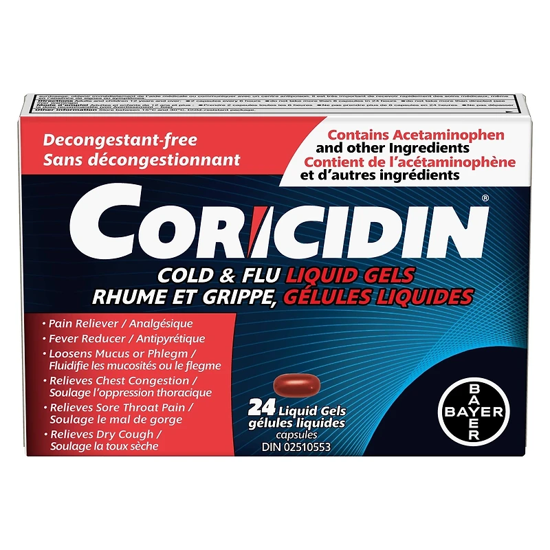 - • Coricidin Cold & Flu Liquid Gels provide fast, effective relief of cold & flu symptoms while being decongestant-free. • Get effective relief of cold and flu symptoms such as dry cough, chest congestion, headaches, minor aches and pain, sore throat, and fever. • Relieves bothersome chest congestion and loosens mucus and phlegm. Effective Cold and Flu symptom relief that is decongestant-free. • Each Coricidin Cold & Flu capsule contains 325 mg of Acetaminophen to help relieve pain and reduce fever, 10 mg of Dextromethorphan Hydrobromide for cough suppression, and 200 mg of expectorant Guaifenesin to relieve chest congestion and loosen mucus and phlegm. • Comes in concentrated liquid gel capsules. Adults and children 12 years and over, take 2 capsules every 6 hours. Do not take more than 8 capsules in 24 hours. To be sure this product is right for you, always read and follow the label.