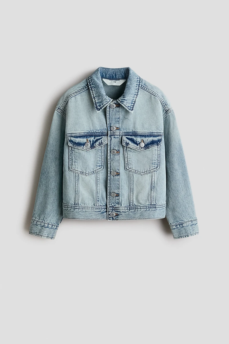 Jacket in washed cotton denim. Collar, buttons at front, yoke at front and back, and chest pockets with flap and button. Dropped shoulders and long sleeves with button at cuffs.