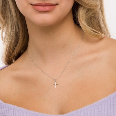 Simple and elegant, this cross pendant reflects your faith. Created in sterling silver, this look showcases a petite diamond-accented cross. Polished flared edges highlight the sparkling centre. Buffed to a brilliant lustre, this pendant suspends along an 18.0-inch rope chain that secures with a spring-ring clasp.
