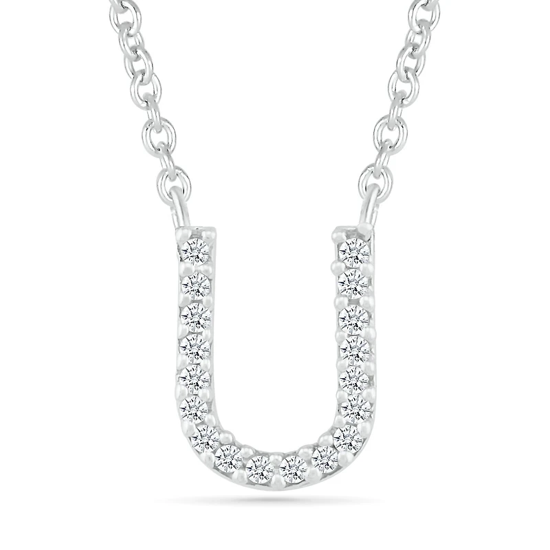 Embrace personal elegance with the Diamond Addiction sterling silver 'U' initial necklace. Adorned with shimmering diamonds, this piece beautifully combines a modern minimalist design with timeless sparkle—a stunning expression of individuality and sophistication.