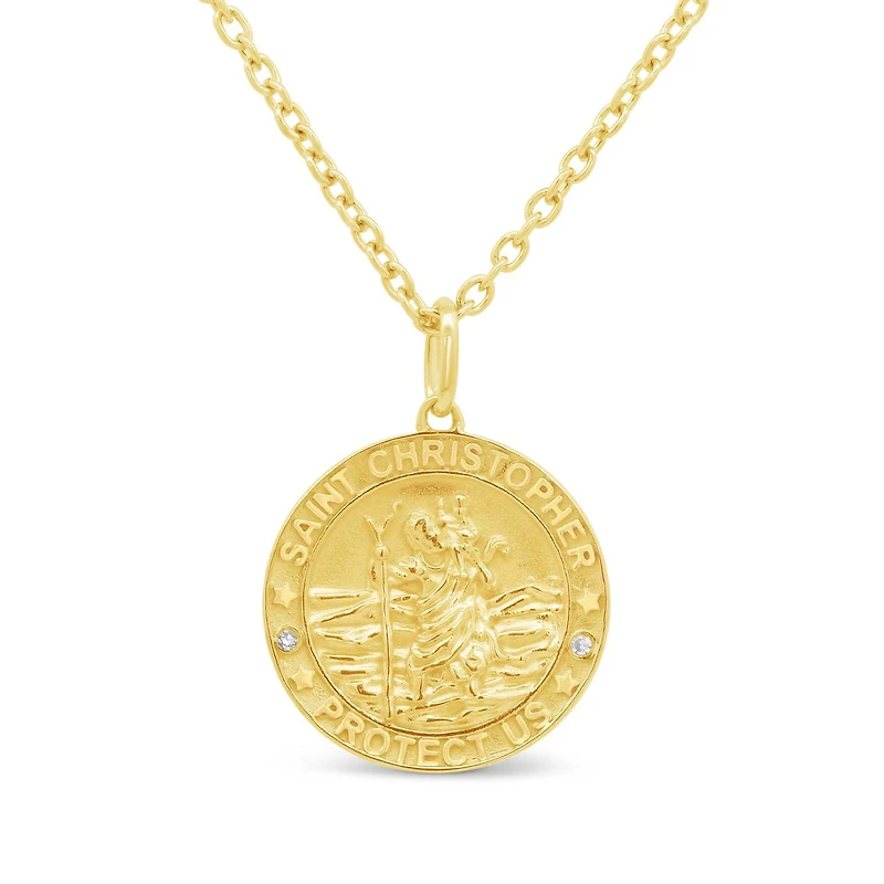This Diamond Saint Christopher Pendant features a richly detailed medallion design accented with subtle diamond highlights. Crafted in luminous 18K yellow gold vermeil, the coin‑style pendant showcases a textured finish with a raised Saint Christopher motif and engraved detailing along the border for added dimension.  A powerful symbol of protection, it makes a thoughtful gift or a distinctive addition to any jewelry collection.