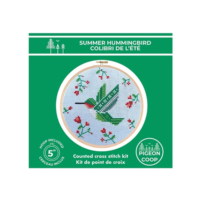 This cross stitch kit includes everything needed to complete your very own summer hummingbird! A lovely activity for beginners.Includes:  patterns with symbols in colour and in black and white  bilingual instructions (French-English) one 5" embroidery hoop one piece of blue Aida fabric one tapestry needle pre-cut DMC threads in 7 colours