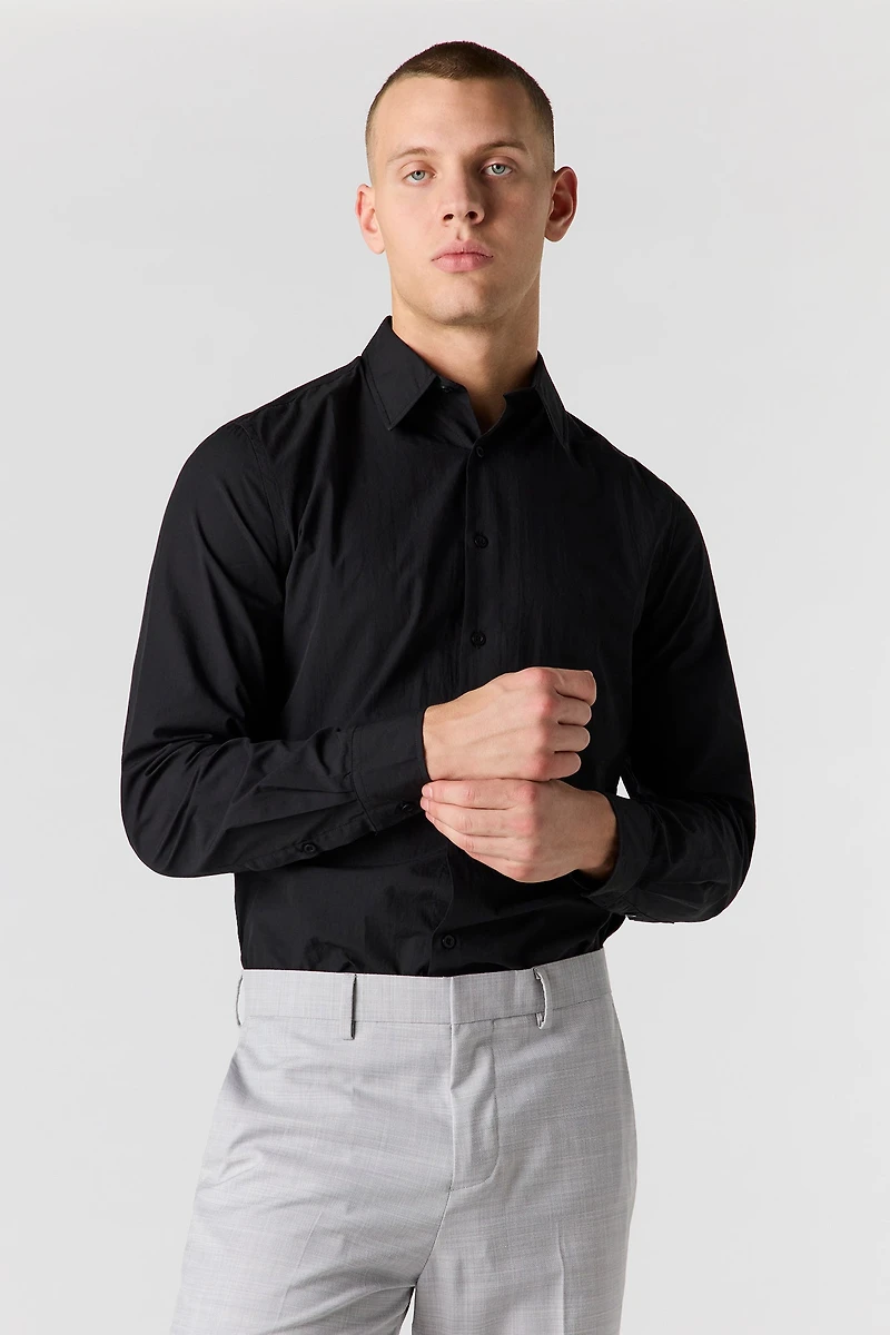 This dress shirt features poplin material, collared neckline, button-up front, long sleeves, and buttoned cuffs.