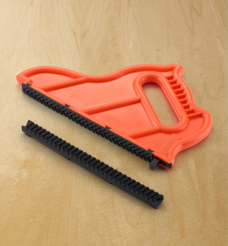 This push stick offers an advance over traditional designs. Developed to provide single-hand workpiece leverage and control, it has high-friction polymer elastic traction treads that not only grip well, but also help reduce stock kickback and lift.
