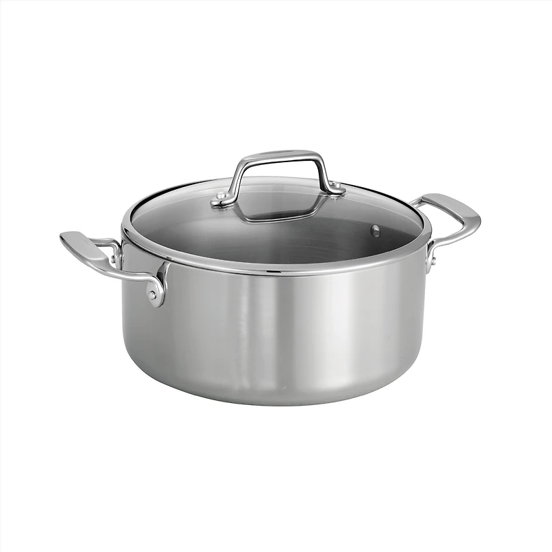 Durable 5 Qt stainless steel Tri-Ply Clad Dutch oven with lid, designed for even heat distribution and everyday cooking.